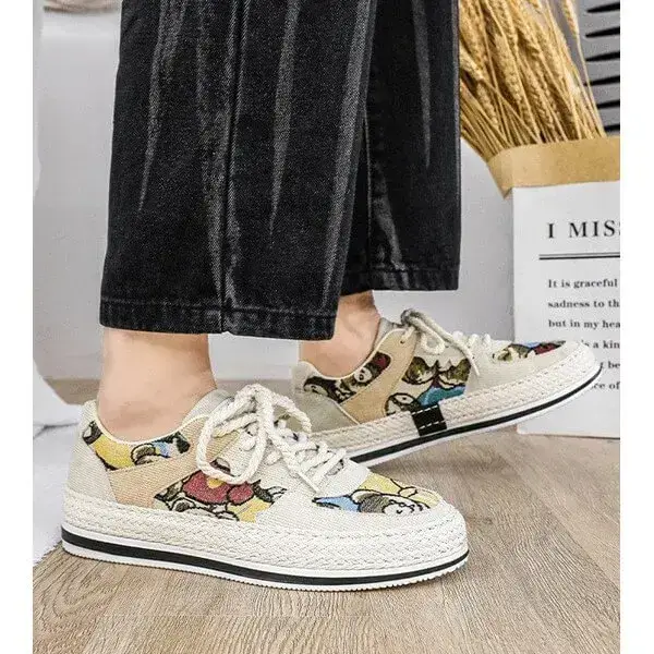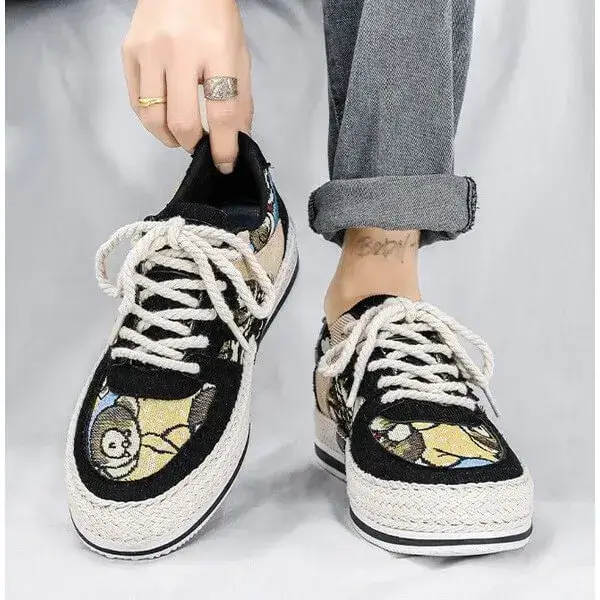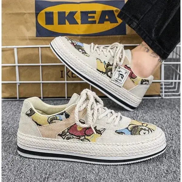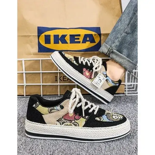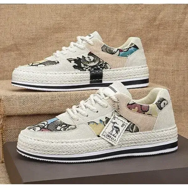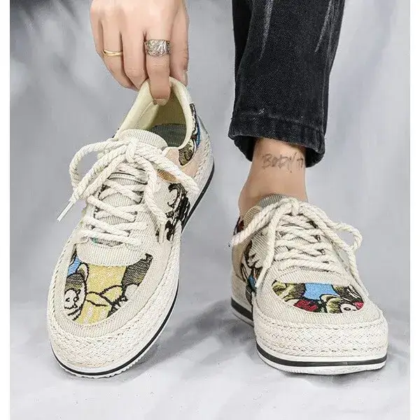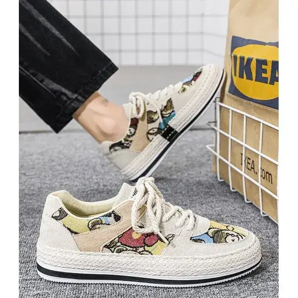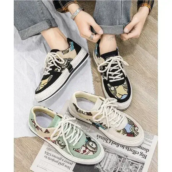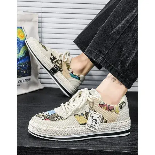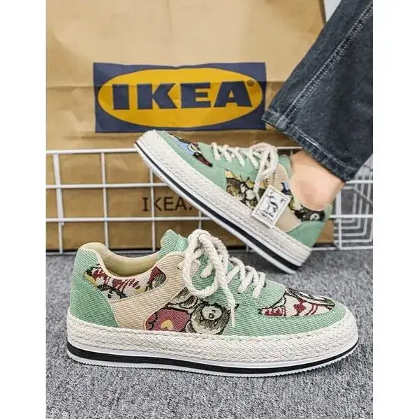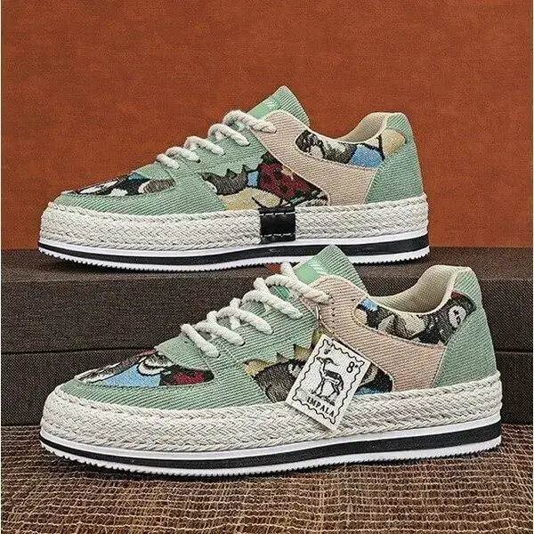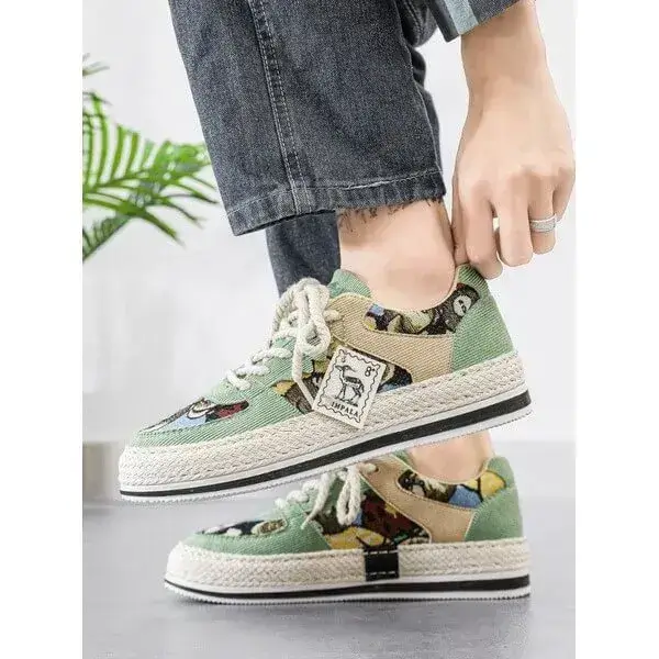 Stay stylish and protected with our Mens Color-Matching Canvas Sneakers. These UV-resistant low-top casual shoes in Beige, Black, and Green feature a breathable canvas upper and a durable rubber sole with braided edges. Perfect for sunny days, they blend vibrant design with functionality, accented by "IMPIALA" branding.