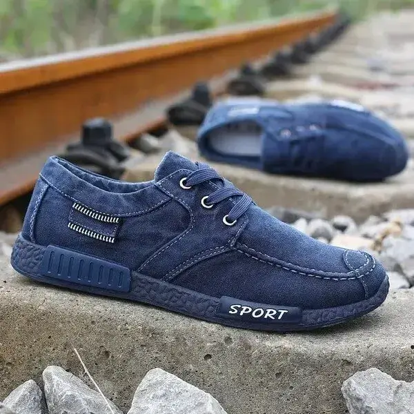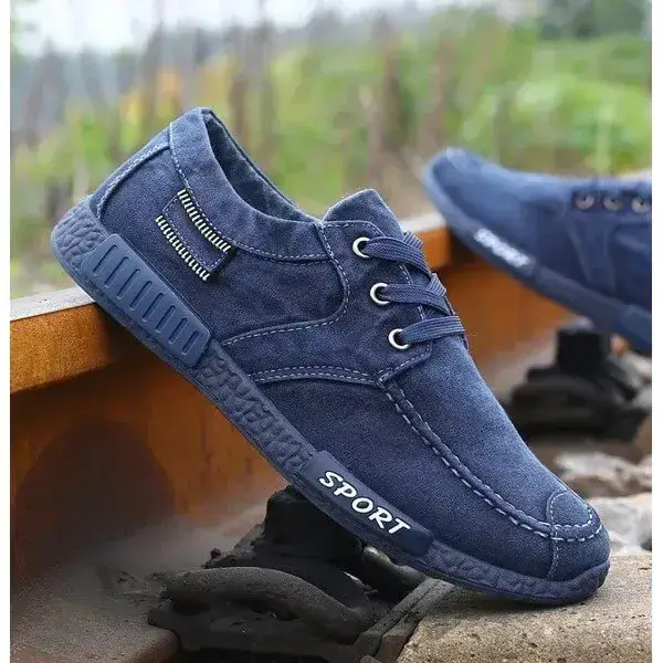 Step confidently with our Mens Non-Slip Canvas Shoes. These stain-resistant low-top casual shoes in Blue, Black, and Grey feature a breathable canvas upper and a non-slip rubber sole for reliable grip. Perfect for everyday wear, they offer durability and easy maintenance with "SPORT" branding.