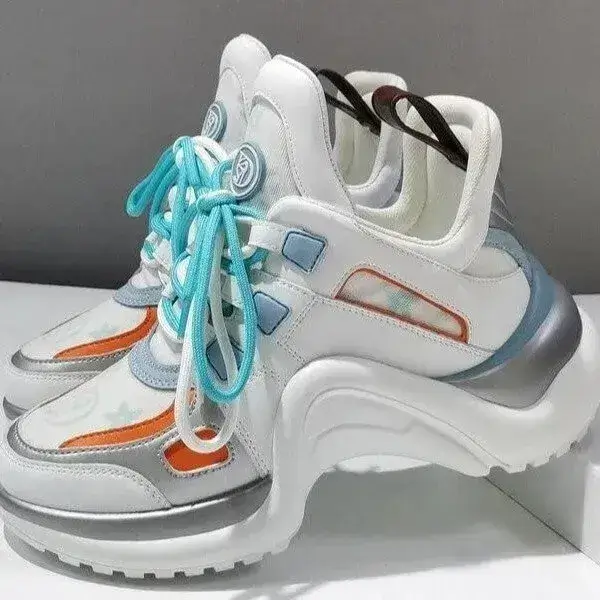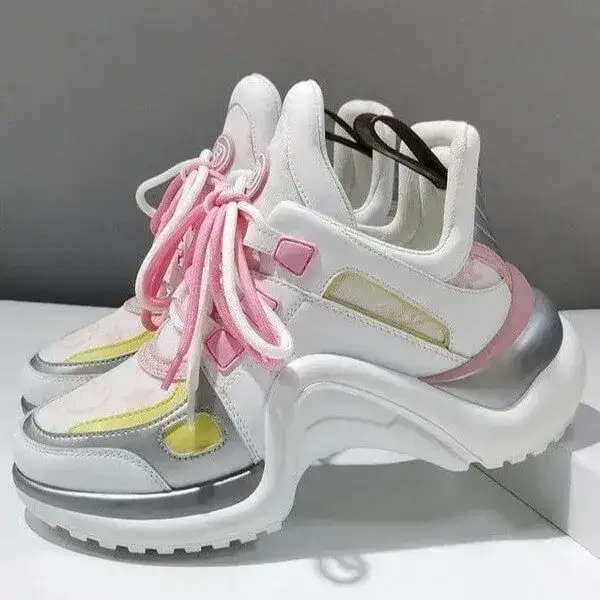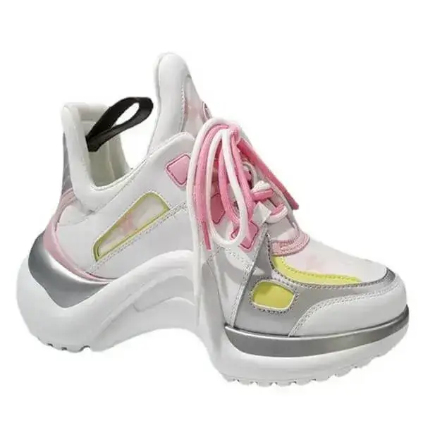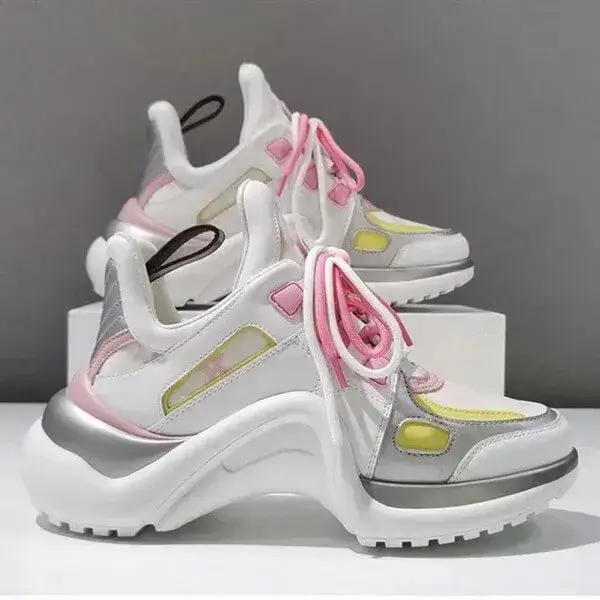 Step into bold comfort with our Womens Chunky Sneakers. These temperature-regulating low-top sports shoes in Pink and Sky Blue feature a PU upper, a net lining, and a distinctive alien heel on a durable rubber sole. Ideal for active wear or casual outings, they offer style and climate adaptability.