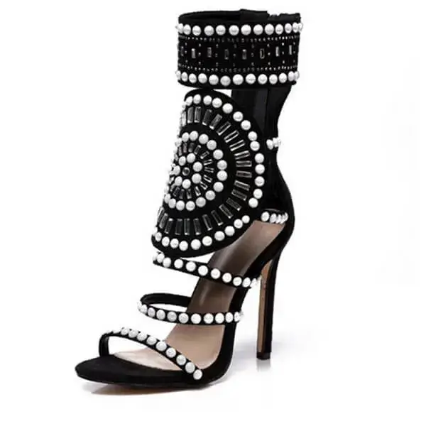 Elevate your elegance with our Womens Colorblock High Heels. These hollow-out open-toe stiletto shoes in Black and Peach feature a reflective suede upper with pearl and rhinestone embellishments, paired with a durable PU sole. Ideal for special occasions, they offer a glamorous look with comfort and visibility.