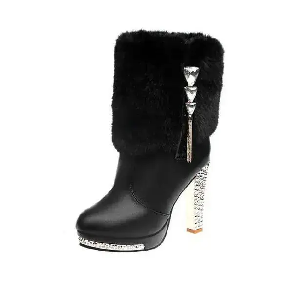 Elevate your wardrobe with our Womens Plush Boots. These pointed toe rhinestone chunky heel platform shoes in Black and White feature a temperature-regulating plush lining and a PU upper, paired with a durable rubber sole. Ideal for transitional seasons or evening wear, they blend luxury with comfort and durability.